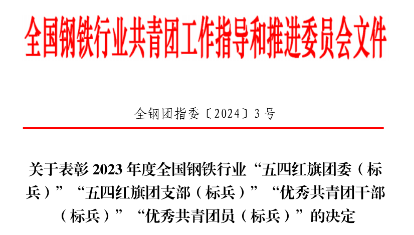 全国钢铁行业共青团工作指导和推进委员会下发了《关于表彰2023年度全国钢铁行业“五四红旗团委(标兵)”“五四红旗团支部(标兵)”“优秀共青团干部(标兵)”“优秀共青团员(标兵)”的决定》,williamhill威廉希尔团总支被授予“全国钢铁行业‘五四红旗团支部’”荣誉称号。