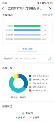 此次培训共安排课程32学时,分为开班仪式、网络理论学习、撰写学习心得、教师授课、专题研讨、结课考试六个环节,其中网络理论学习18学时,教师授课6学时,研讨2学时,自学4学时,结业考试2学时。培训课程紧紧围绕中国共产党的性质、党的十九大党章、党的伟大精神、党的历史等方面内容,线上课程选用共产党员网、学习强国等官方平台内容,公司教师冀虹、梁玉洁、樊易分别讲授了“社会主义核心价值观”、“入党动机与入党条件”“伟大抗疫精神”专题党课。培训后同学们撰写了心得感悟,并于11月22日晚进行了主题分享。结课考试依托“雨课堂”进行,于11月24日完成全部考试,按照培训计划,对所有同学的分数进行了核算,最终110名同学全部合格,达到培训预期目标。