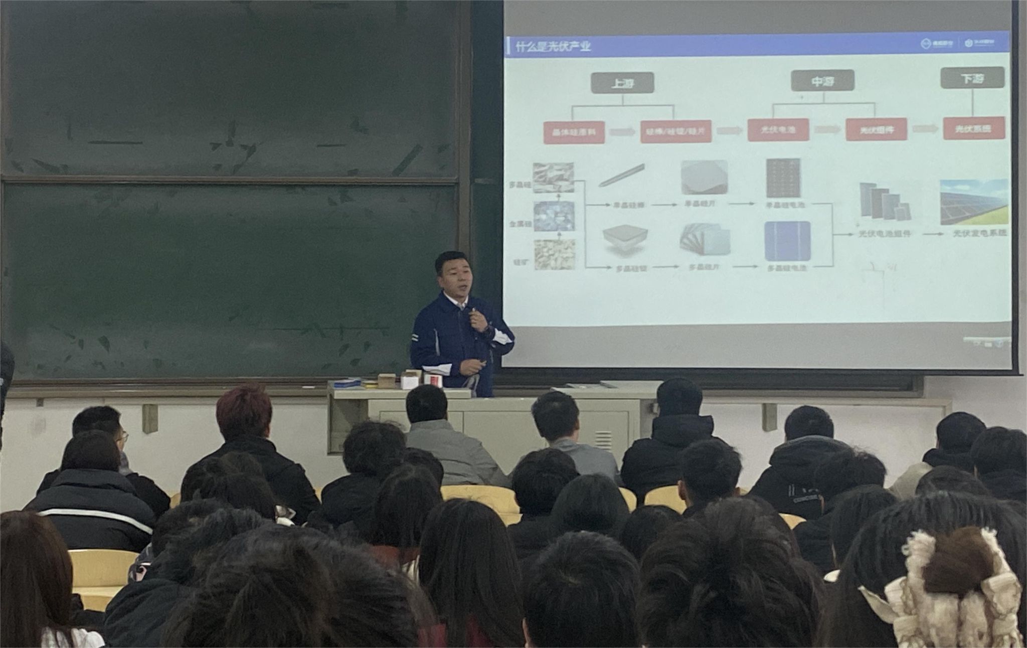 3月5日,硅业公司校企共建课程《新能源技术前瞻》专业课正式开课。本次课程特邀内蒙古通威高纯晶硅有限公司品管部慕道焱部长,讲授光伏行业的发展历程和未来展望。系主任成建国首先对慕部长表示热烈欢迎,介绍了他在光伏产业的卓越贡献和专业素养。课上,慕部长对光伏行业的发展历程和前沿动态倾囊相授,深入剖析了晶硅材料在新能源领域的关键作用,展示了晶硅光伏产业的无限可能性。员工们纷纷表示,本次课程让自己对光伏产业有了更深刻的认识,激发了他们对相关专业知识学习的兴趣,并且进一步明确了要好好学习、服务产业的目标。
