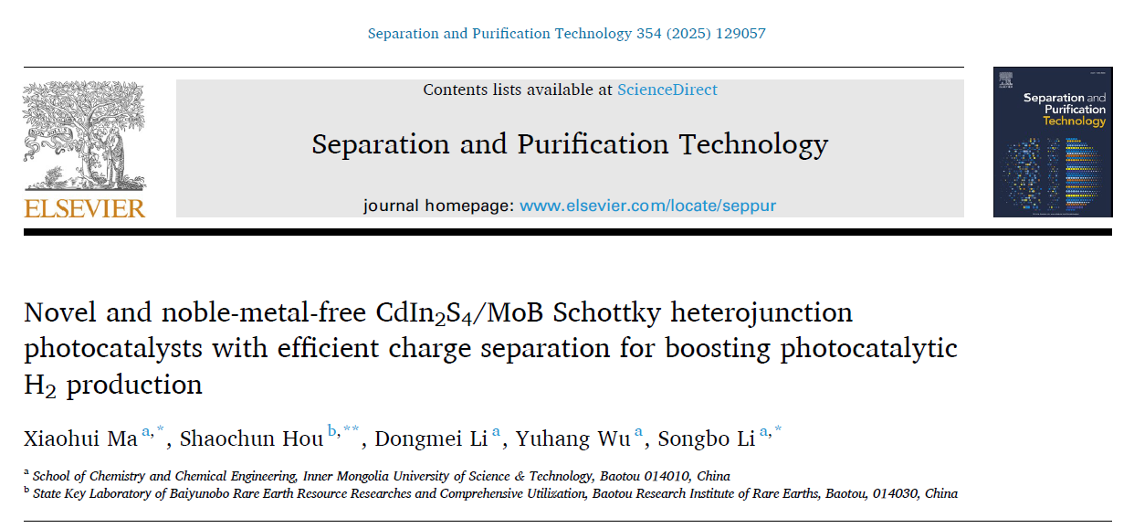近日,公司马晓辉博士在国际TOP期刊Separation and Purification Technology上发表题为“Novel and noble-metal-free CdIn2S4/MoB Schottky heterojunction photocatalysts with efficient charge separation for boosting photocatalytic H2production”(Sep. Purif. Technol. 354 (2025) 129057)的重要研究成果。马晓辉博士为该论文第一作者兼通讯作者,公司李松波教授和包头稀土院侯少春所长为共同通讯作者,williamhill威廉希尔为本论文的第一完成单位。
